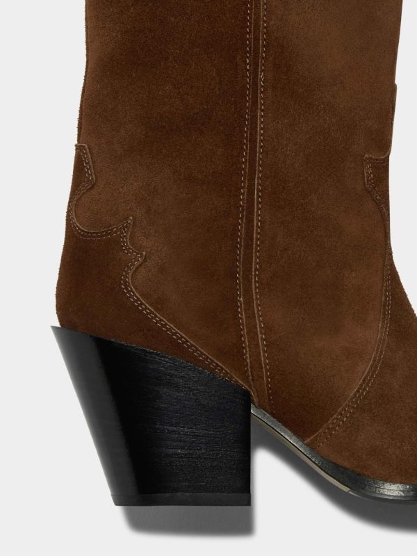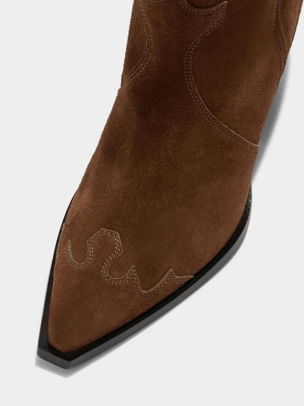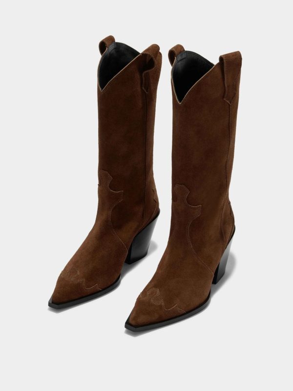 Ariel is Aeyde’s contemporary take on cowboy boots crafted from supple suede. This design features classic Western details such as contoured collars and tapered, robust heels.
