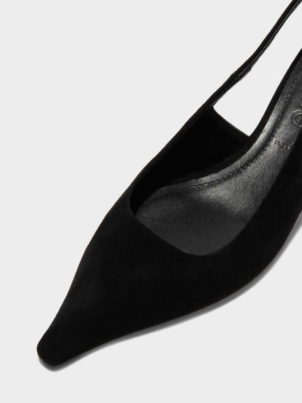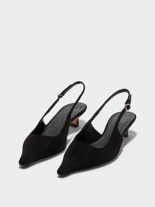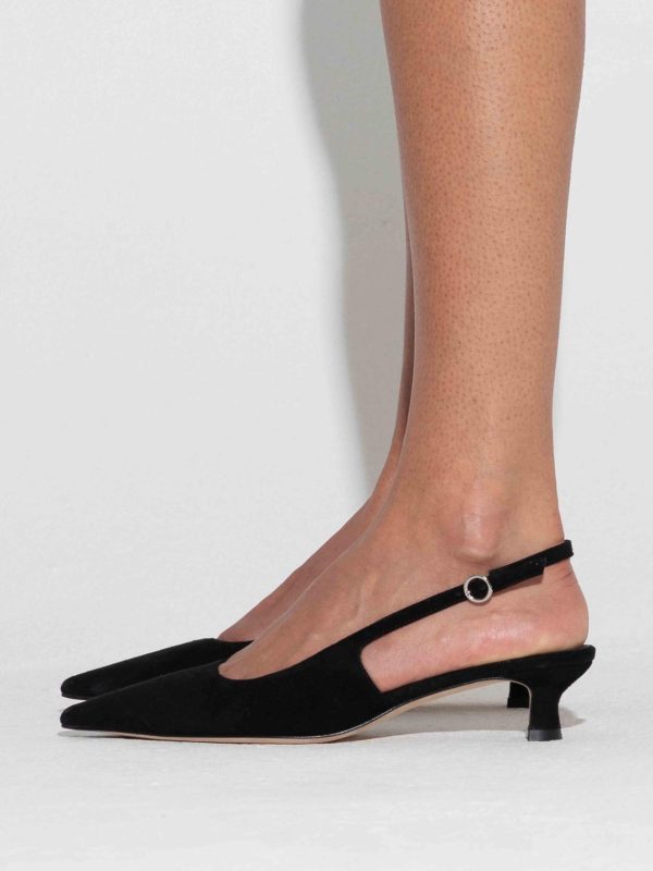Aeyde’s elegant chisel-toe pumps featuring tapered kitten heels, adjustable slingback straps, and bespoke anti-slip soles. This season, we introduce Catrina in soft kid suede.