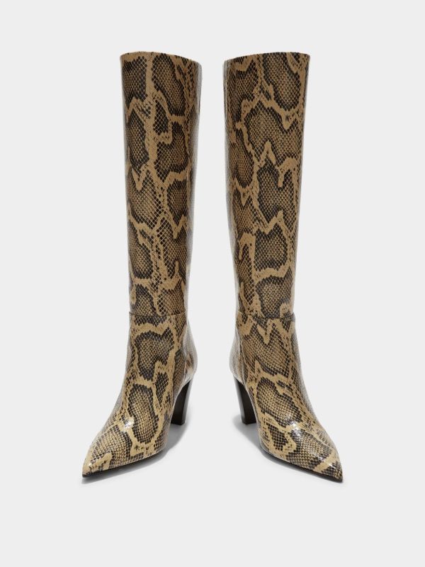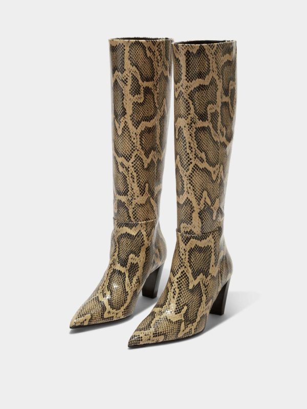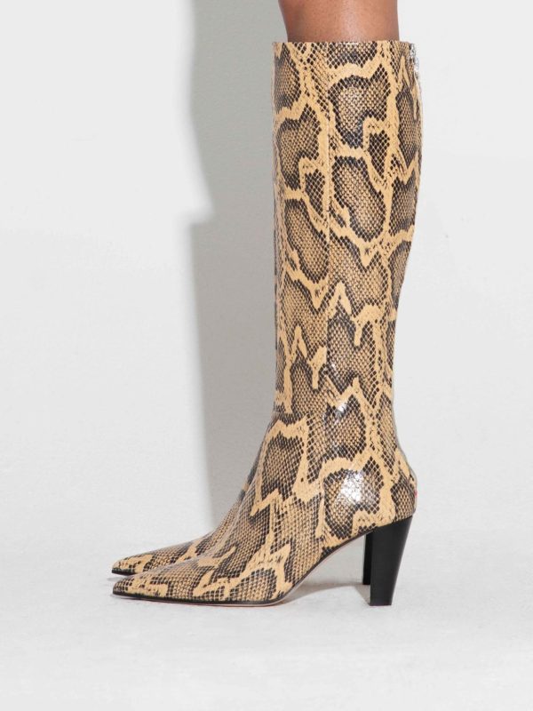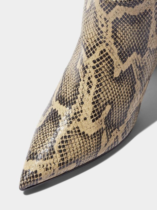Cecilia leads Aeyde’s new family of neat, point-toe boots. They are crafted from snake-effect calfskin leather with proportion in mind, balancing full-zip fitted shafts with chic 75mm tapered heels.