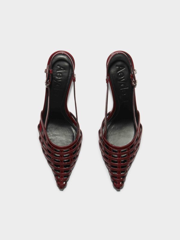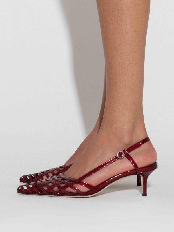 Distinct, striking and modern, Aeyde’s Helit pump features a severe pointed toe with caged details, complete with a delicate slingback straps. This design sits on a slim mid-heel and is crafted from metallic patent calf leather.