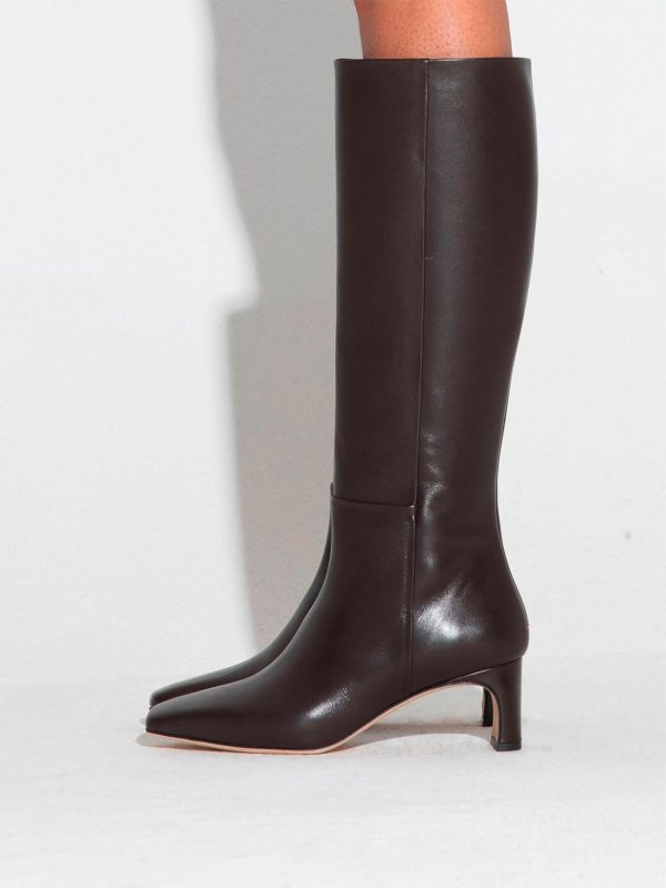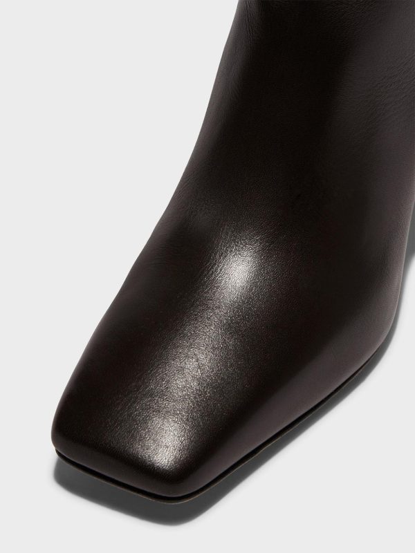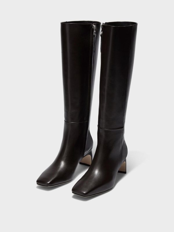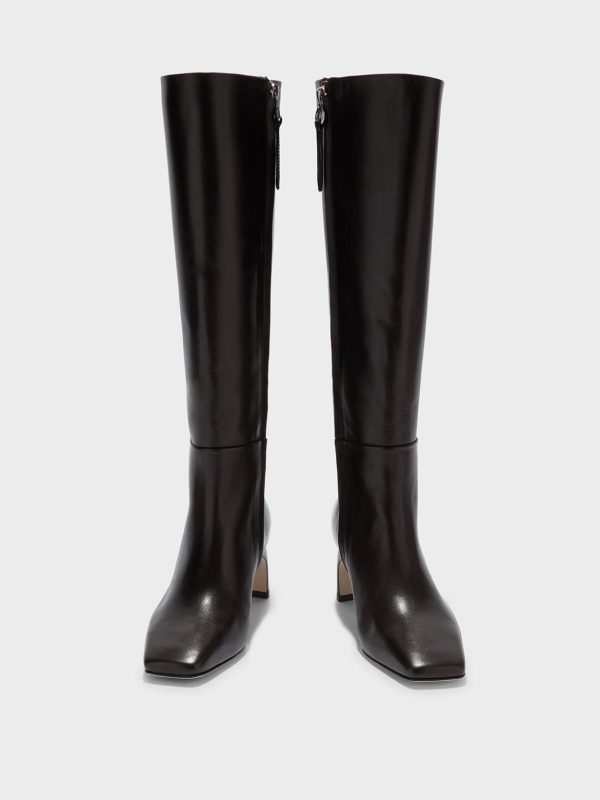 Torin are minimal knee-high boots crafted from soft, fine-grain calfskin leather and fully lined in lambskin—renowned as the softest material for footwear. This design’s tapered square toes and streamlined shafts adhere to Aeyde’s minimalistic design sensibilities.
